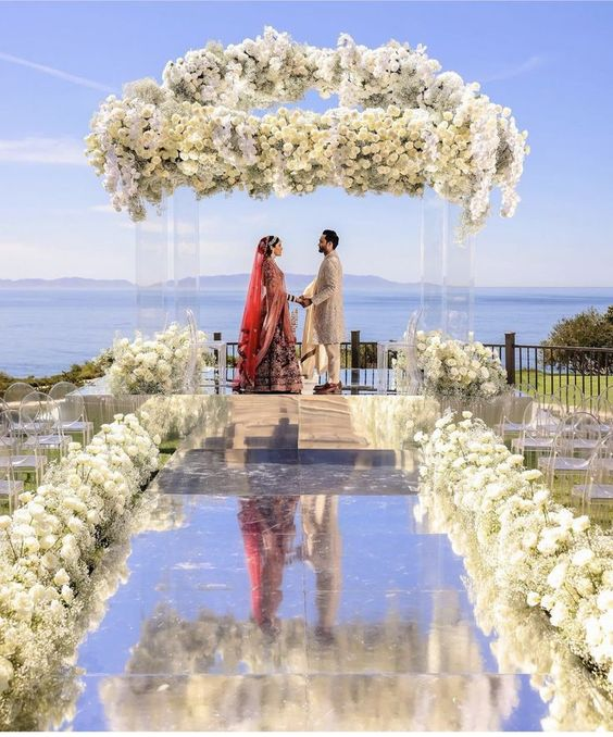 The beach itself is a complete natural backdrop with a combination of blue sky and green water. A subtle flower theme will look gorgeous in the mandap areas, where you can put seashells as a table centrepiece. While choosing the decor, do not forget about the onshore breeze, and you can experiment with drapes for a flowy effect.